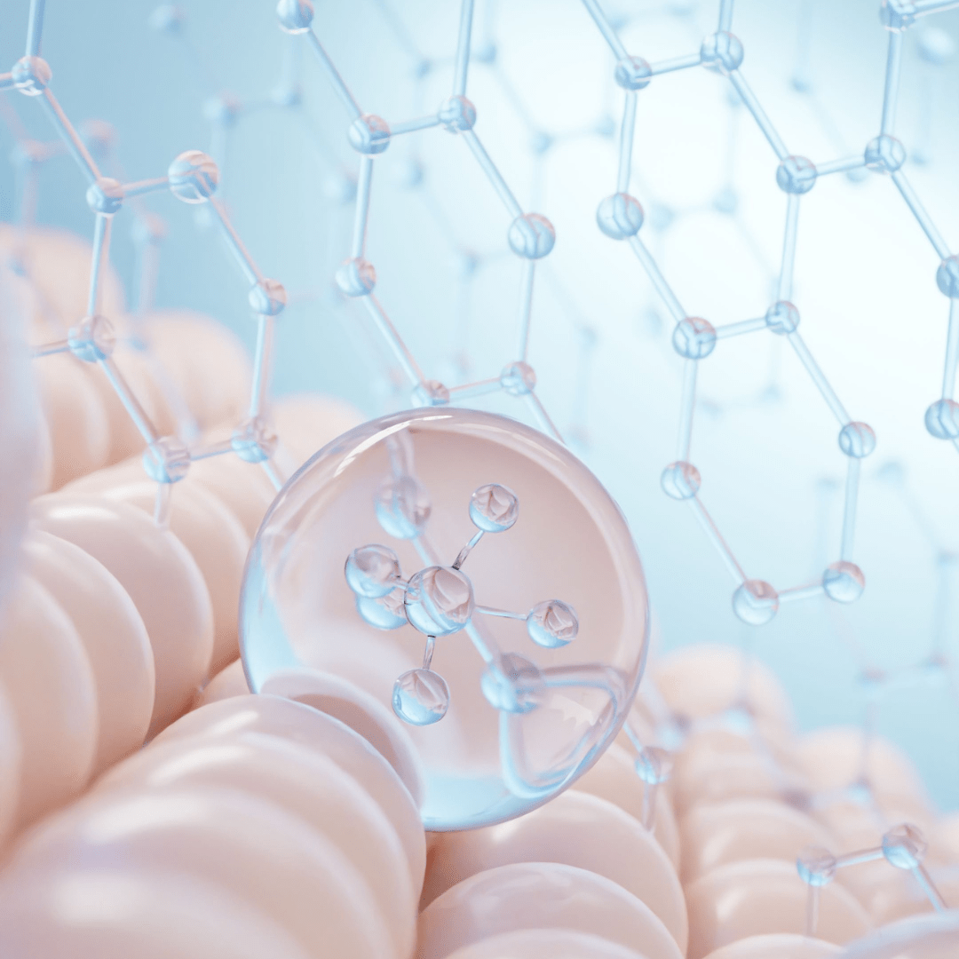 Wissenschaftliche 3D-Darstellung von Molekülstrukturen, die auf Hautzellen wirken. Das Bild symbolisiert die innovative Wirkung von Anti-Aging-Seren, Retinol und Hyaluron – für eine straffe, jugendliche und gepflegte Haut. Ideal als Visualisierung für Kosmetik, Hautpflege und Seren mit hochwirksamen Inhaltsstoffen.