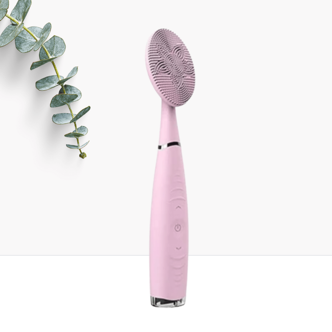 Produktfoto einer rosafarbenen elektrischen Gesichtsreinigungsbürste von Bio Beauty Attack. Das Gerät hat eine runde Silikonbürste mit feinen Noppen und mehrere Bedienknöpfe am Griff. Links im Bild dekorativer Eukalyptuszweig. Ideal für die tägliche Gesichtsreinigung, zur Förderung einer reinen, strahlenden Haut und zur sanften Massage.