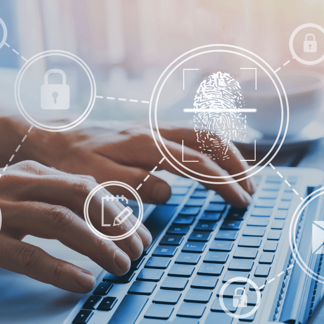 Das Bild zeigt Hände, die auf einer Laptop-Tastatur tippen, während darüber holografische Symbole für Cyber-Sicherheit schweben – darunter ein Fingerabdruck-Scanner, Schloss-Icons und vernetzte Sicherheitssymbole. Es vermittelt die Themen Datenschutz, Identitätsprüfung, Online-Sicherheit und moderne digitale Technologien.