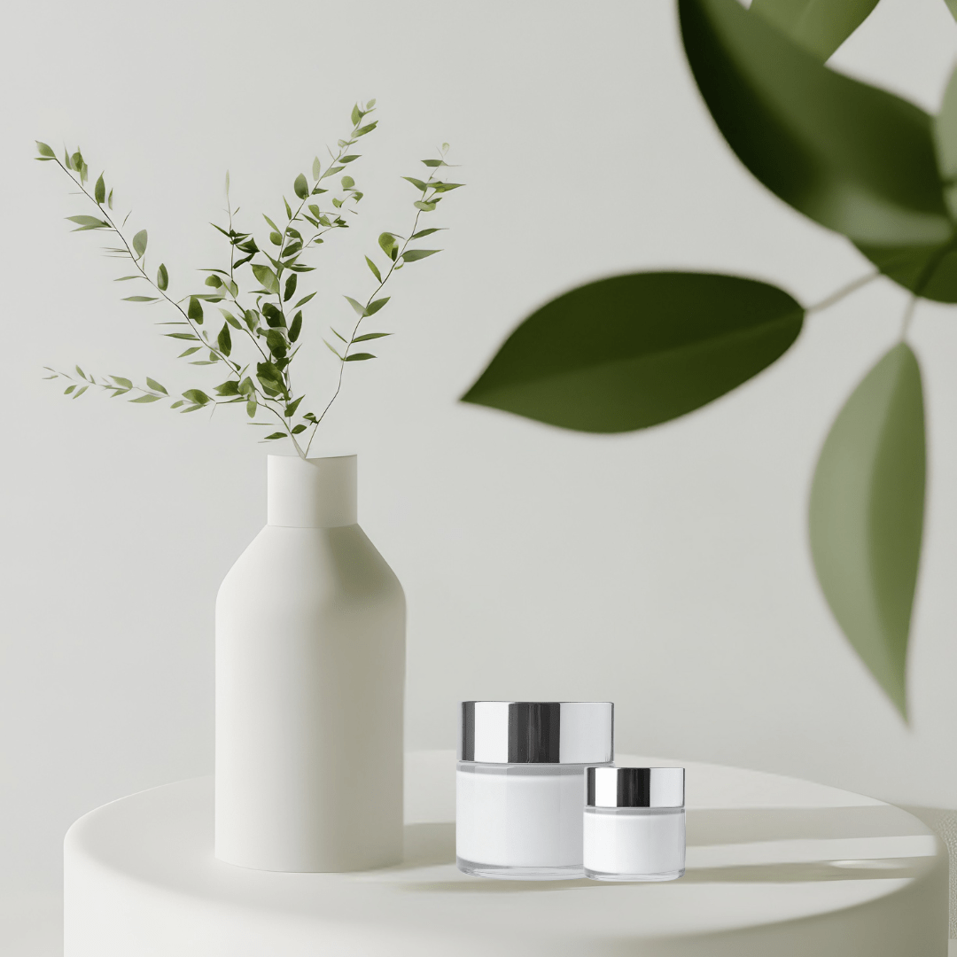 Kategorie-Bild für Kosmetik & Pflege bei Bio Beauty Attack. Abgebildet sind luxuriöse Cremetiegel auf hellem Hintergrund mit modernen, minimalistischen Elementen. Symbolisch für hochwertige Gesichtspflege, Anti-Aging-Seren, Masken und tägliche Pflegerituale.